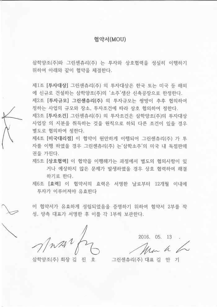 2016년 5월 13일 미국 그린센추리(주)와 투자 및 독점판매권 MOU 체결